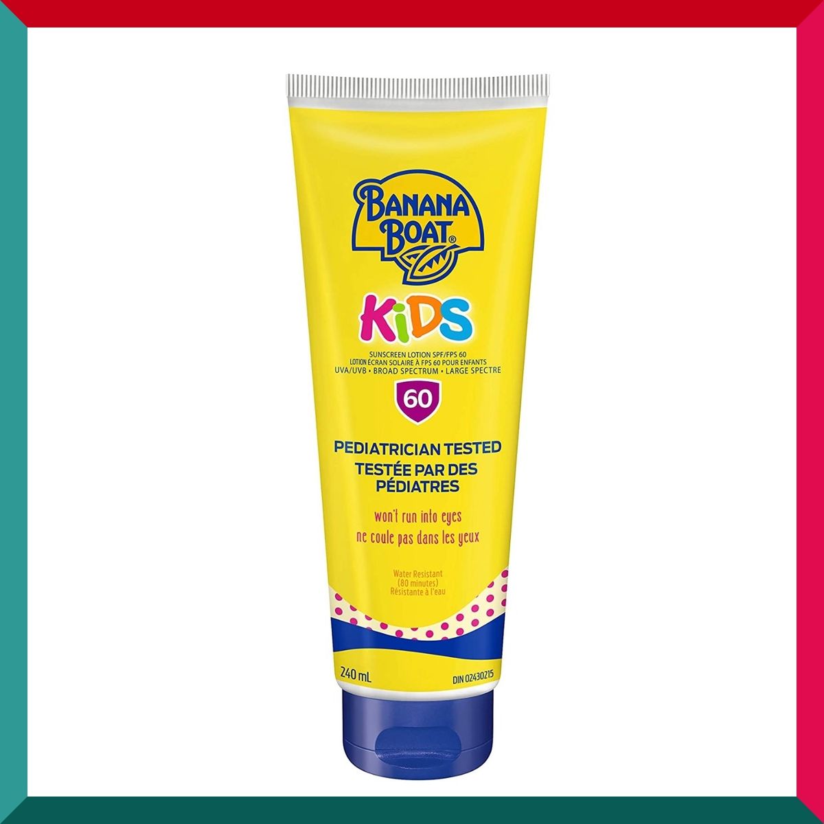 Banana Boat Kids 防曬無淚乳液 SPF 60 可保護兒童免受太陽的 UVA 和 UVB 射線的傷害。它具有防水功能,因此您可以在水中和水外盡情玩耍。該乳液經過兒科醫生測試並得到皮膚癌基金會的推薦。